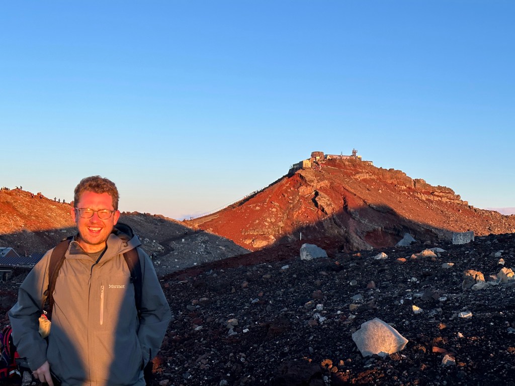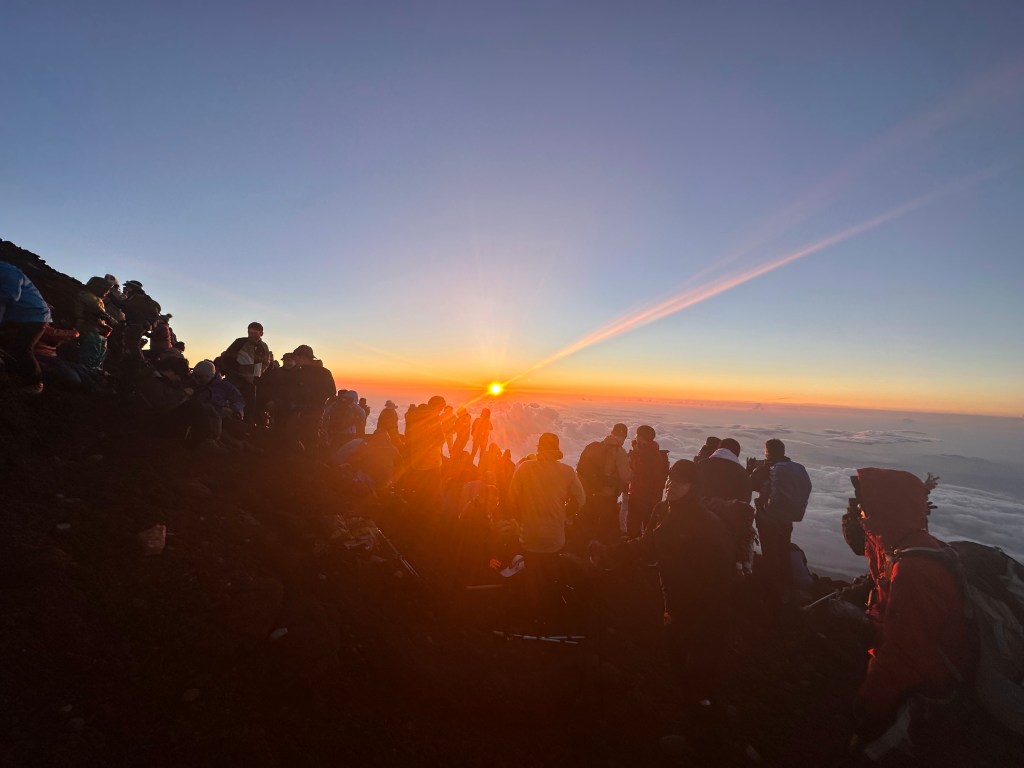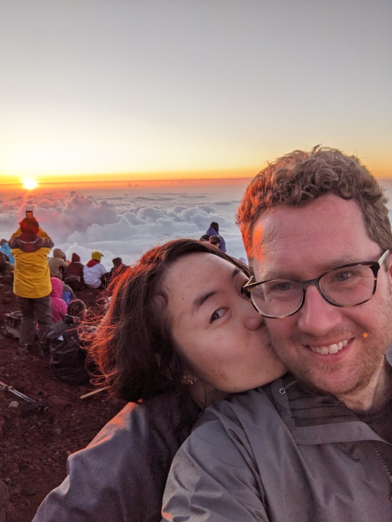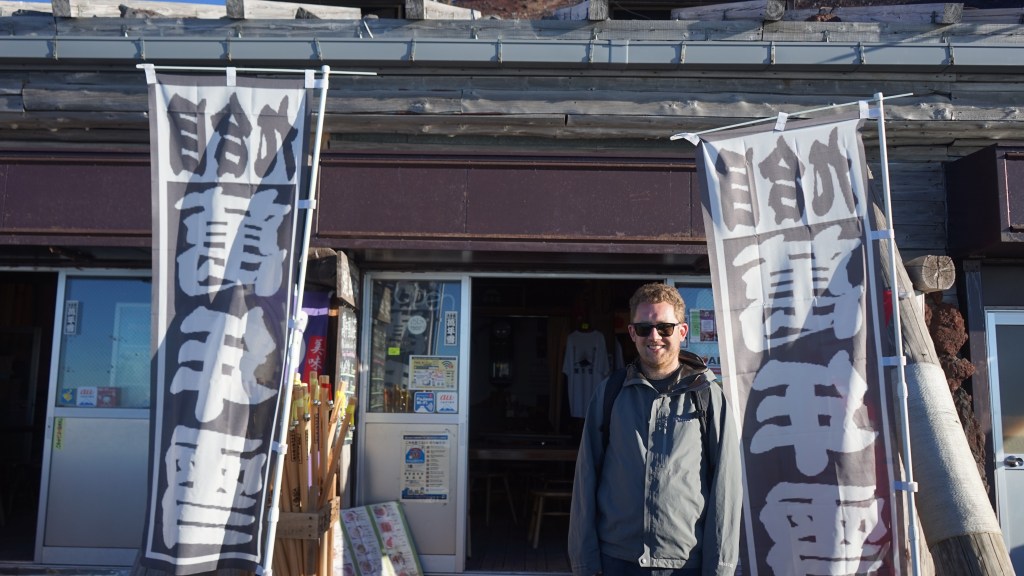 When we finally reached the summit, I had a headache, my watch registered a blood oxygen of around mid 60s, and I felt as though I was going to cry. The mountain hut was pretty cute though! It had everything we needed. Here is a picture of us getting our curry dinner from a man with an “I ❤ Fuji” tee. So amazing. The immense pride and love we felt for one another at the top made the trip worth it.