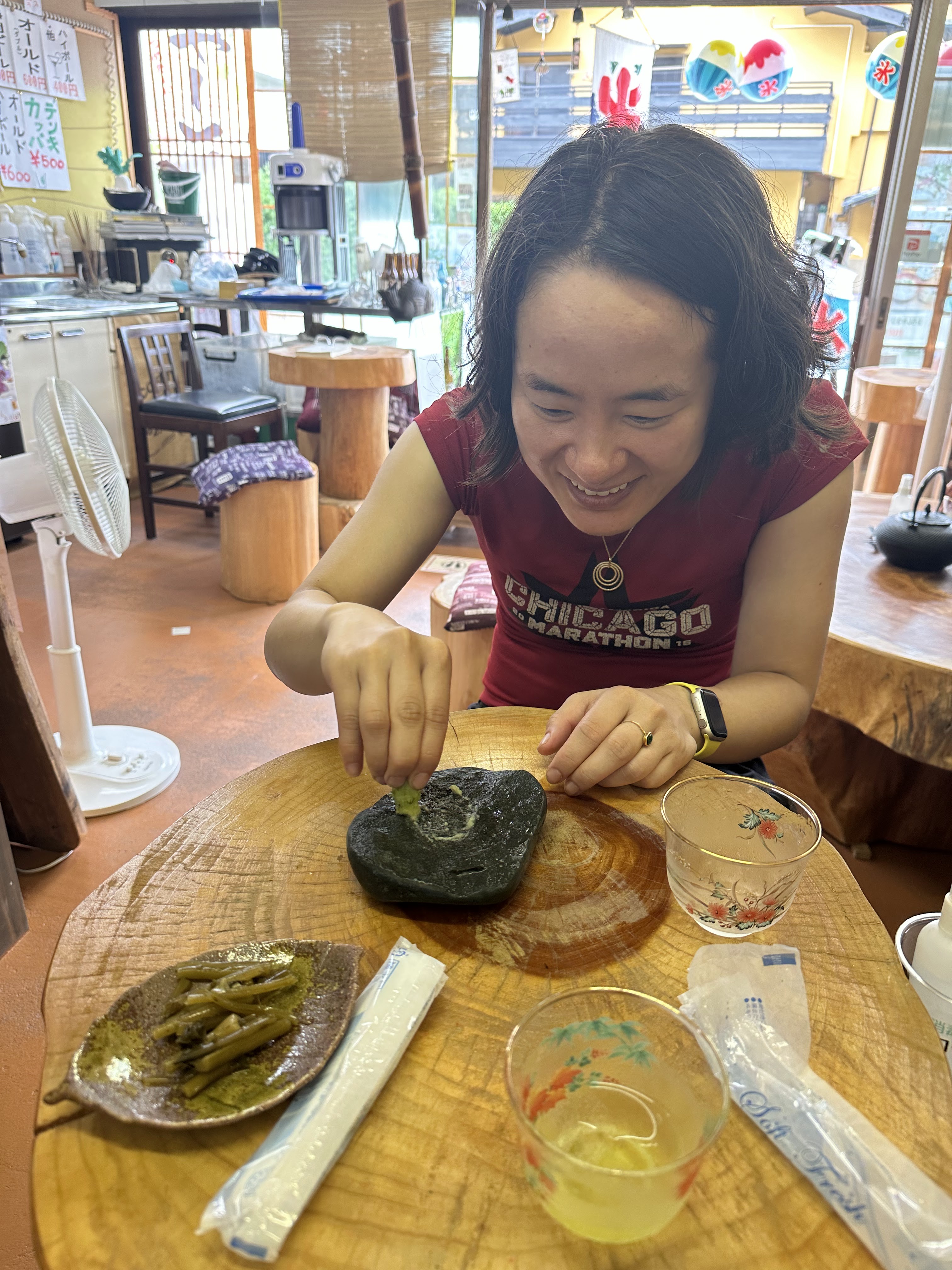 When we arrived at the ryokan, it felt like I died and was waiting for someone to receive us at heaven’s gate. Their front door opened to a magnificent open view of a lush garden with a waterfall. They turned us down at first (said we were too early!) and told us to come back in an hour. We went to have lunch at a small place serving soba noodles down the street, where they gave us part of a whole wasabi root to grind up! When they finally received us, the first thing they did was take our hiking boots, never to be seen again till after checkout. (We only had a drawstring bag and our backpacks because we had wisely shipped our luggage to the hotel in Kyoto. )