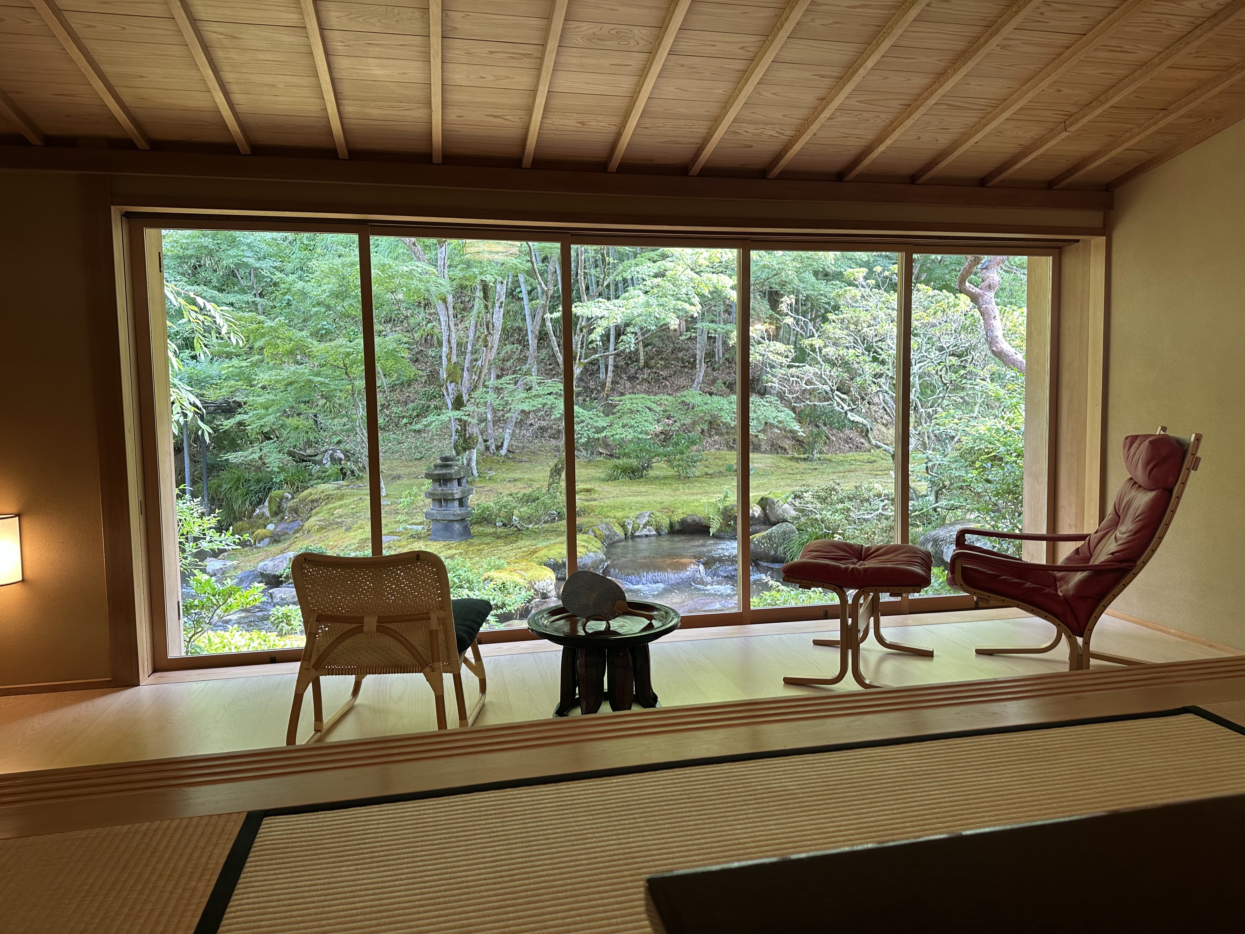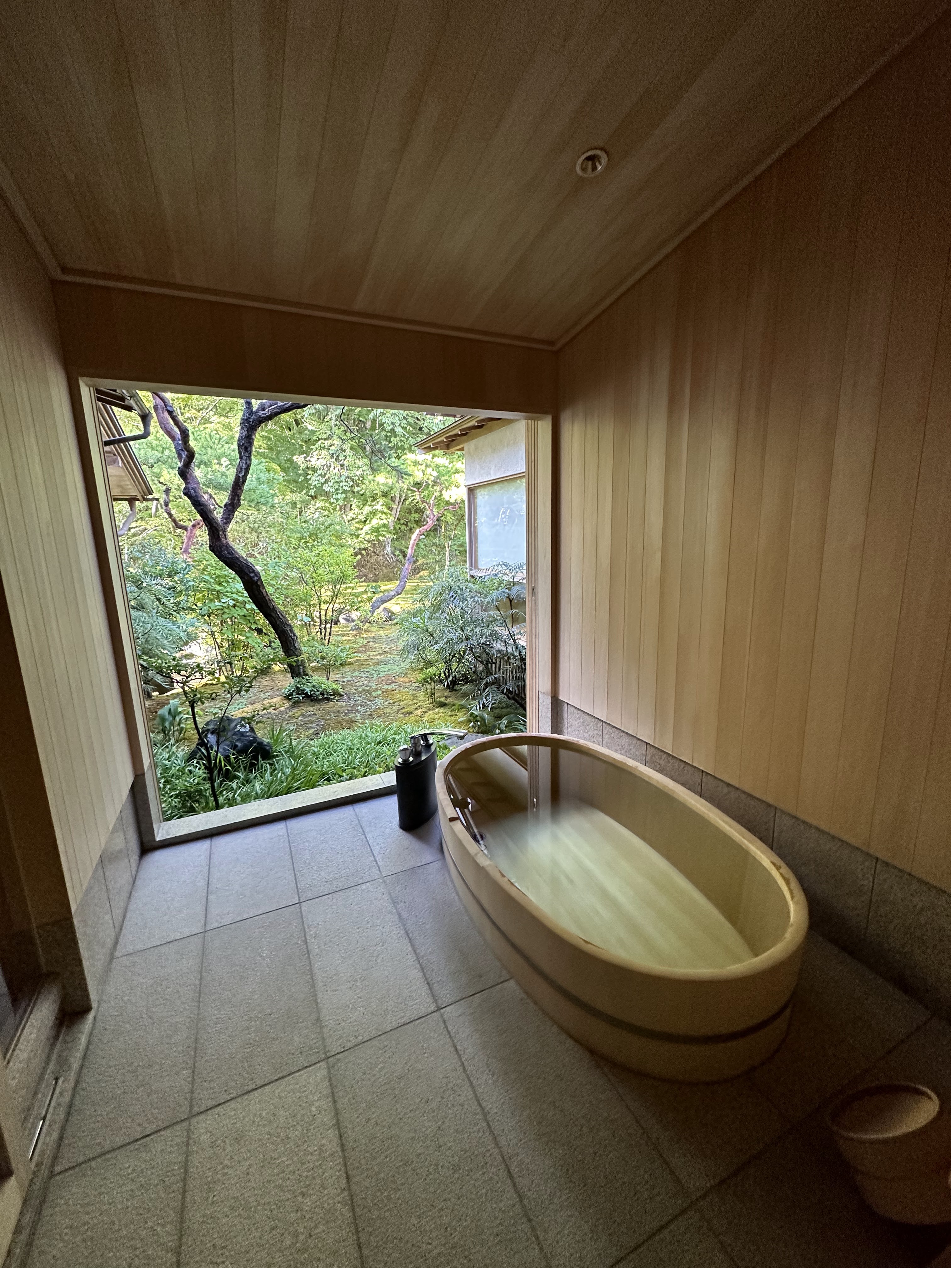 The centerpiece of a ryokan are the onsens! Bathing at a Japanese ryokan is quite iconic. Our suite had an incredible private onsen. A tub made out of hinoki cypress that emanated a cedar smell when you poured hot water in it, in a room with a wall that opened completely to the garden. The tub itself is filled to the brim upon your arrival, and it is designed to poor water out of the sides like a waterfall as you enter it, perhaps a gesture of abundance. I could sit in that tub and stare at the garden for ages!
